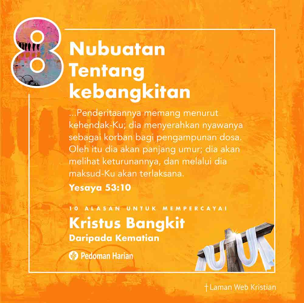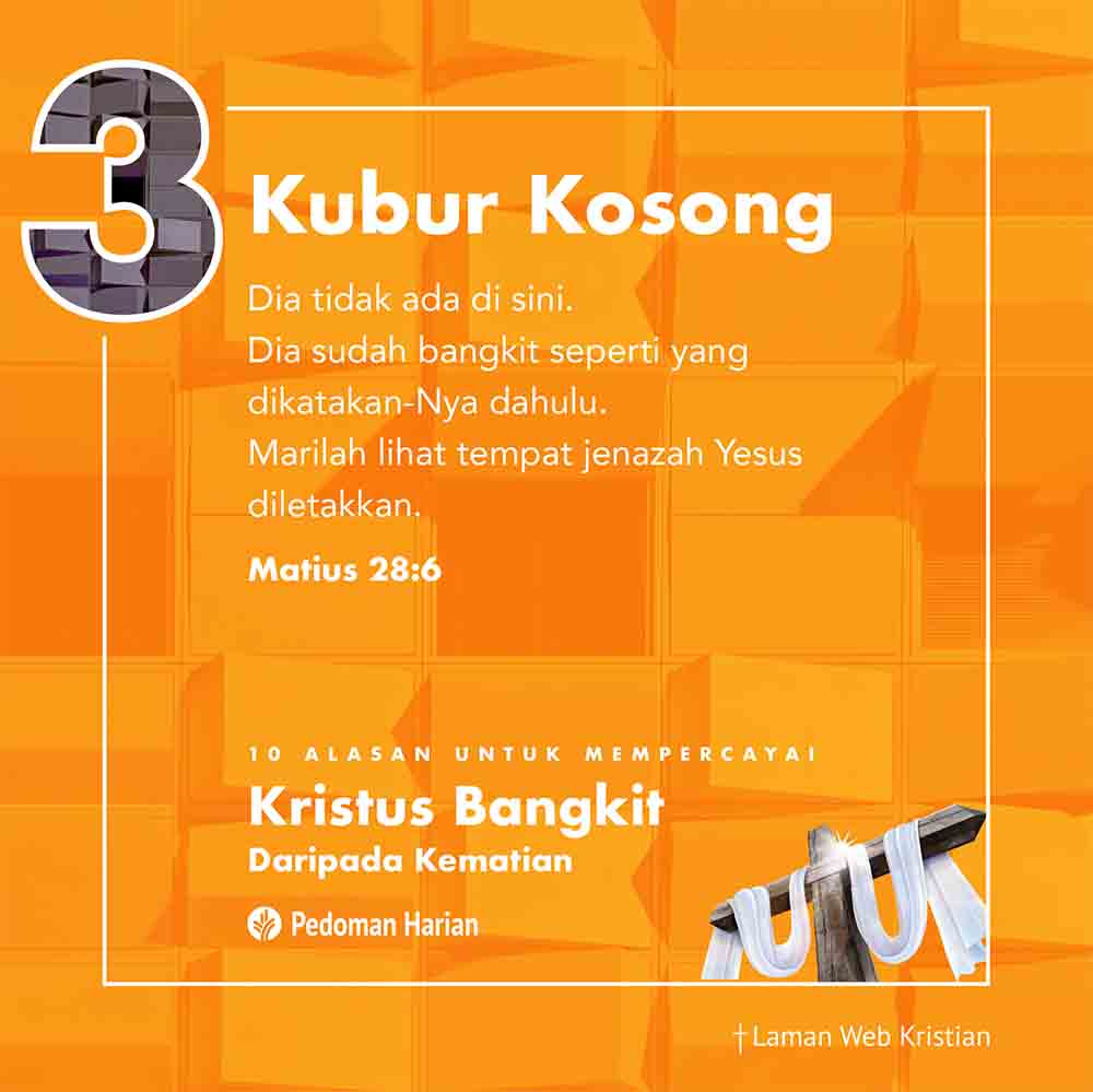 "Inilah perkara terpenting: Kristus mati kerana dosa kita, sesuai dengan yang tertulis di dalam Alkitab. Hal ini juga tertulis di dalam Alkitab: Dia dikuburkan dan pada hari ketiga Dia dihidupkan semula." (1 Korintus 15:3-4)